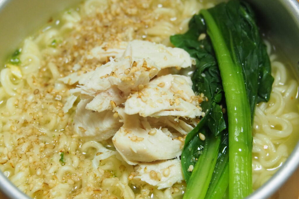 最後に小松菜・ちぎったささみ・付属のごま・ネギ油をかけて完成です。
